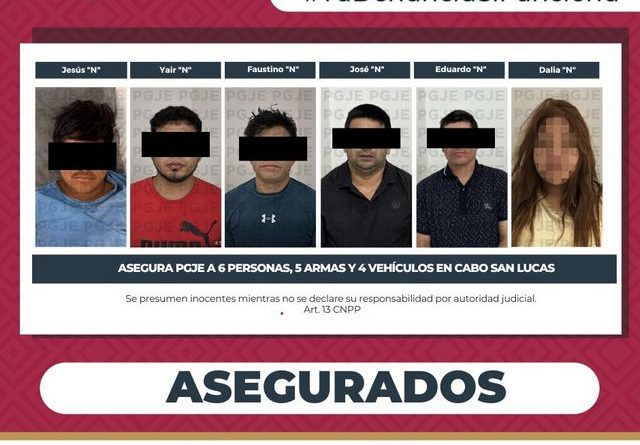 Asegura PGJE a 6 personas, 5 armas y 4 vehículos en Cabo San Lucas.