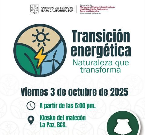El Gobierno del Estado, a través de la Secretaría de Planeación Urbana, Infraestructura, Movilidad, Medio Ambiente y Recursos Naturales (SEPUIMM), invita a la ciudadanía a la presentación oficial de la campaña de transición energética, naturaleza que transforma, que se llevará a cabo el viernes 3 de octubre a las 17:00 horas en el Kiosco del Malecón de La Paz.