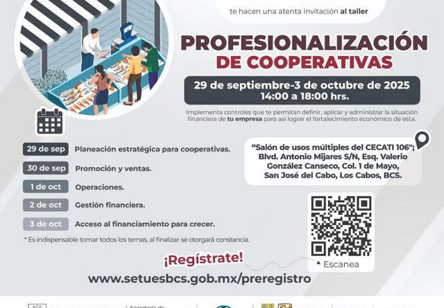 Con el objetivo de fortalecer las capacidades administrativas y financieras de las cooperativas en Baja California Sur, la Secretaría de Turismo y Economía (SETUE), en coordinación con Nacional Financiera y la Dirección General de Fomento Económico de Los Cabos, llevará a cabo un taller de “Profesionalización de Cooperativas”.
