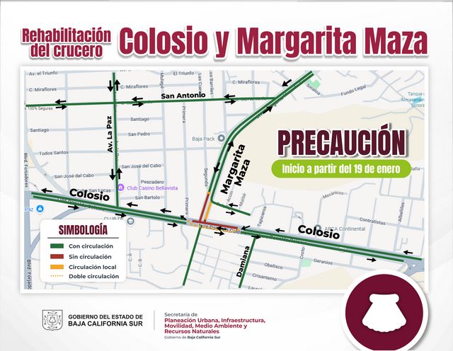 Durante los trabajos, se implementarán rutas alternas: quienes circulen por el bulevar Colosio podrán transitar en doble sentido de la calle Damiana a la calle Primera; del Colosio a Margarita (sentido Los Planes a Forjadores) se desviarán por la calle Calafia hasta la calle Primera; y los vehículos del bulevar Margarita Maza podrán usar la calle San Antonio, que conecta con Avenida La Paz o Forjadores.