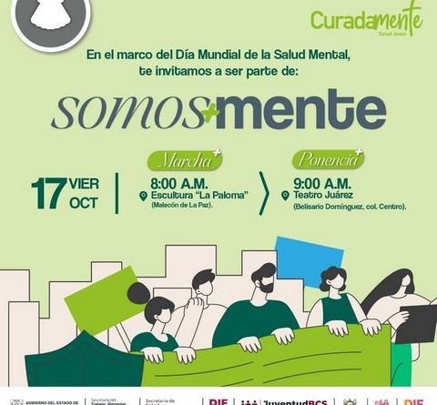 Con el propósito de fomentar el cuidado de la salud mental entre las juventudes de Baja California Sur, el Instituto Sudcaliforniano de la Juventud (ISJUVENTUD), en coordinación con la Dirección de Juventud del Municipio de La Paz, realizará la jornada “Somos + Mentes”, este viernes 17 de octubre, en el marco del Día Mundial de la Salud Mental.